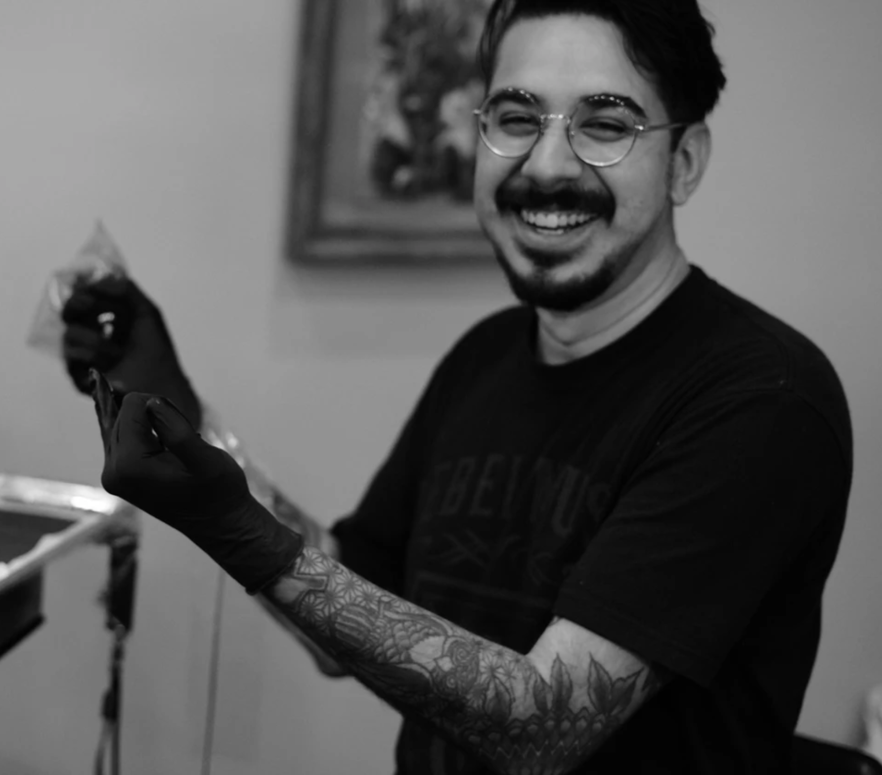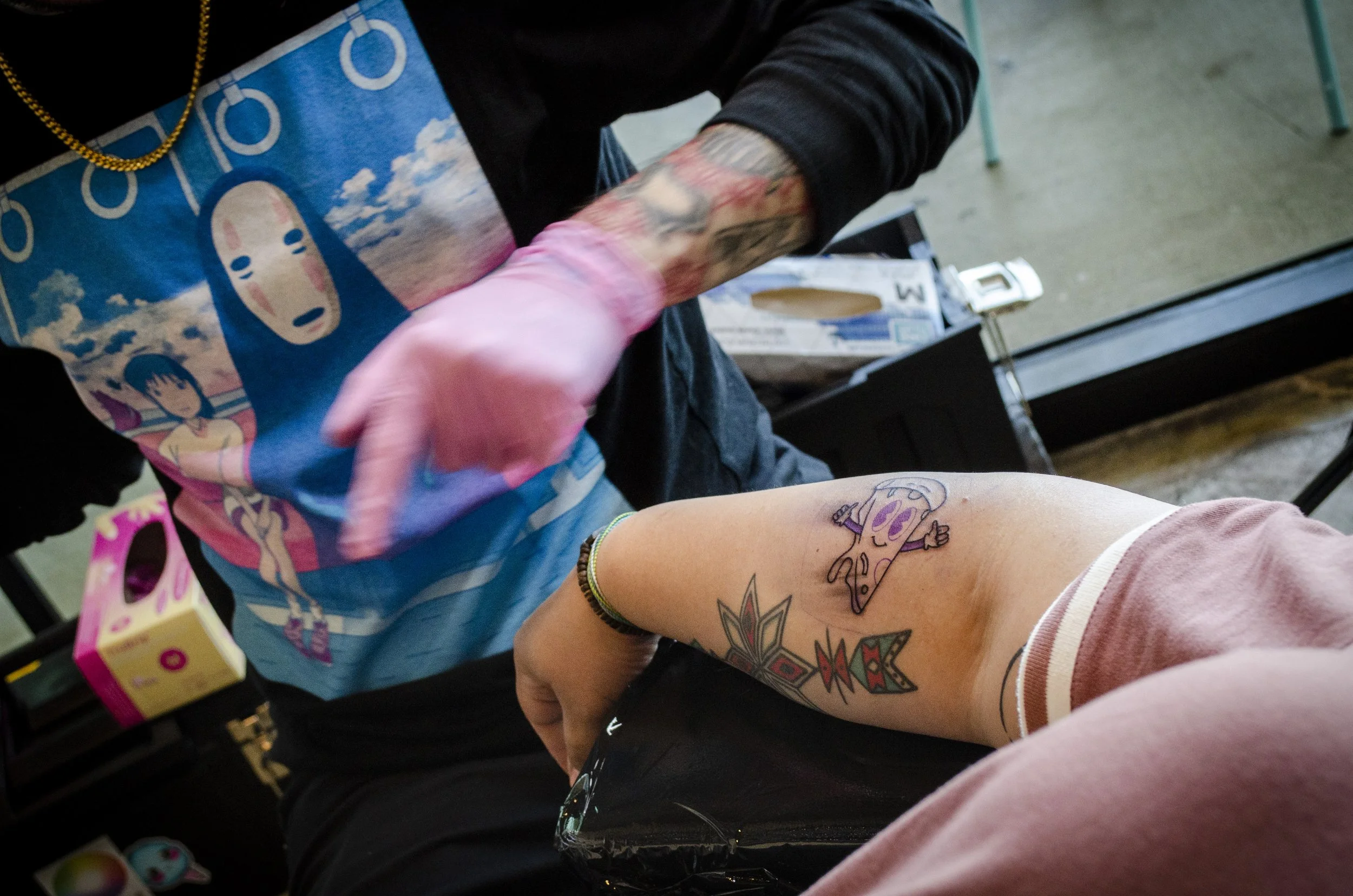 Joe Campos tattooing Crusty the Pizza Man onto an arm.